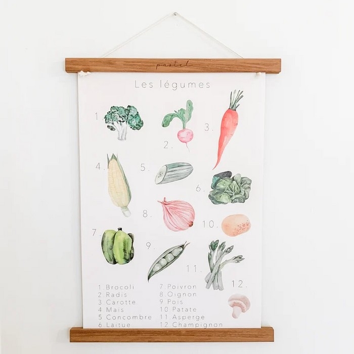 L'affiche Légumes s'intègre merveilleusement bien à la salle de jeux des petits ou à la cuisine! Propice pour inciter au jeu symbolique, elle éveillera la créativité des enfants! Les petits pourront y faire des associations mots-images, apprendre à catégoriser les aliments, nommer les couleurs ou même identifier un aliment lors d'un repas!