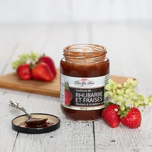 Ingrédients : Fruits (rhubarbe, fraises), sucre, pectine naturelle, jus de citron.