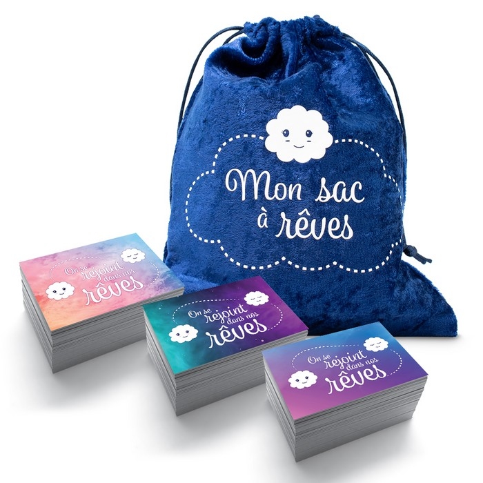 Avant le dodo, l’enfant termine sa routine en pigeant une carte dans le sac, qui révélera le lieu où son parent et lui se rejoindront dans un rêve. À l’aide de son parent, il lit la phrase qui figure sur la carte. Puis c’est le temps de laisser place à la créativité en imaginant ensemble les paysages, les animaux, les bâtiments, les vêtements, etc., selon la destination pigée. Il n’y a aucune limite à l’imagination! Et quand c’est rigolo, c’est encore mieux!